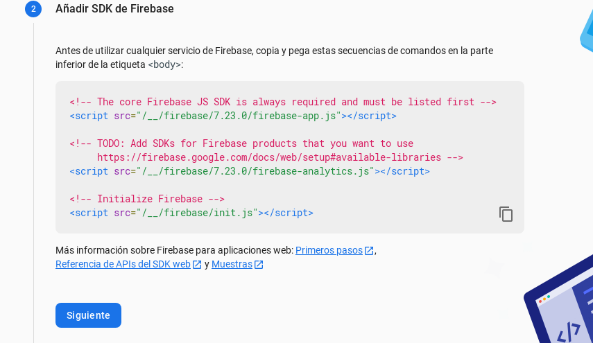 Si estuviéramos trabajando con un proyecto web, tendríamos que usar las librerías cargadas en los head de nuestro archivo HTML, pero en nuestro caso los ejemplos de este blog, se harán usando la librería de angularfire2. En esta parte solo le damos siguiente, si tu proyecto fuese en html directamente, si tendrías que copiar estas cabeceras.