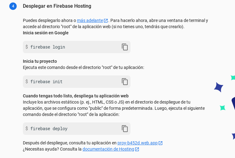 Ahora que ya tienes instalado la CLI de Firebase, puedes ejcutar comandos para inicio de sesión en firebase deployar en el hosting y otros comandos. Te dejo algunos a continuación: